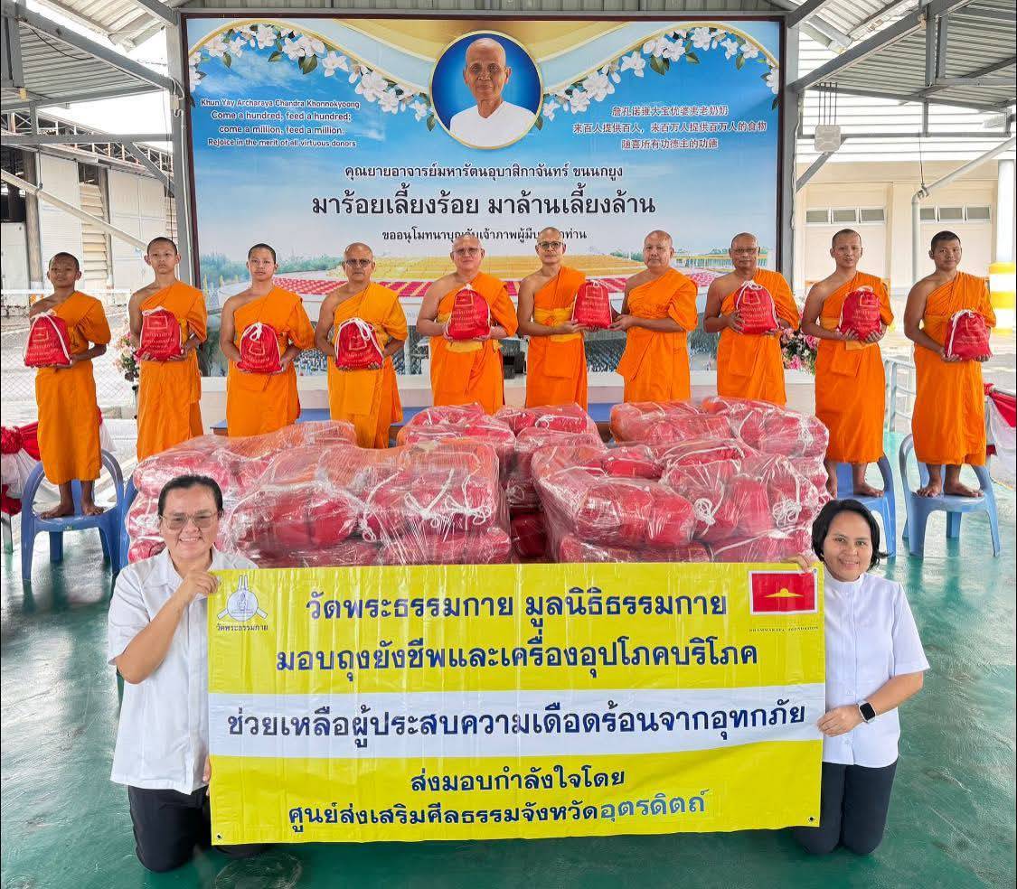 โดยส่งมอบให้กับพระอรรถชาติ อตฺถโชโต ประธานส่งเสริมศีลธรรมจังหวัดอุตรดิตถ์ จากนั้นระหว่างวันที่ 5-8 ตุลาคม คณะสงฆ์และเครือข่ายกัลยาณมิตรศูนย์อบรมเยาวชนอุตรดิตถ์ได้นำถุงยังชีพลงพื้นที่ประสบภัยในอำเภอทองแสนขัน, อำเภอน้ำปาด, อำเภอท่าปลา, อำเภอเมืองอุตรดิตถ์, อำเภอตรอน, และอำเภอพิชัย มอบแก่ประชาชนผู้เดือดร้อน นอกจากนี้ยังได้นำจีวร ผ้าห่ม และเครื่องนอนไปถวายพระภิกษุตามวัดต่างๆ ซึ่งได้รับความเสียหายและอยู่ในระหว่างการฟื้นฟูพื้นที่อีกด้วย โดยกรมป้องกันและบรรเทาสาธารณภัยรายงานว่าคลองตรอนมีจุดวิกฤตน้ำไหลล้นสปิลเวย์อัตราการไหลสูงกว่าปกติมากบ้านเรือนถูกน้ำท่วมถึงชั้นสอง บางหลังโดนน้ำป่าพัดพังเสียหายมีความจำเป็นต้องอพยพประชาชน ระดับน้ำบางจุดเริ่มลดลงเข้าสู่ภาวะฟื้นฟูแต่มีความเสี่ยงต่อการกลับมาท่วมซ้ำหากฝนตกต่อเนื่อง