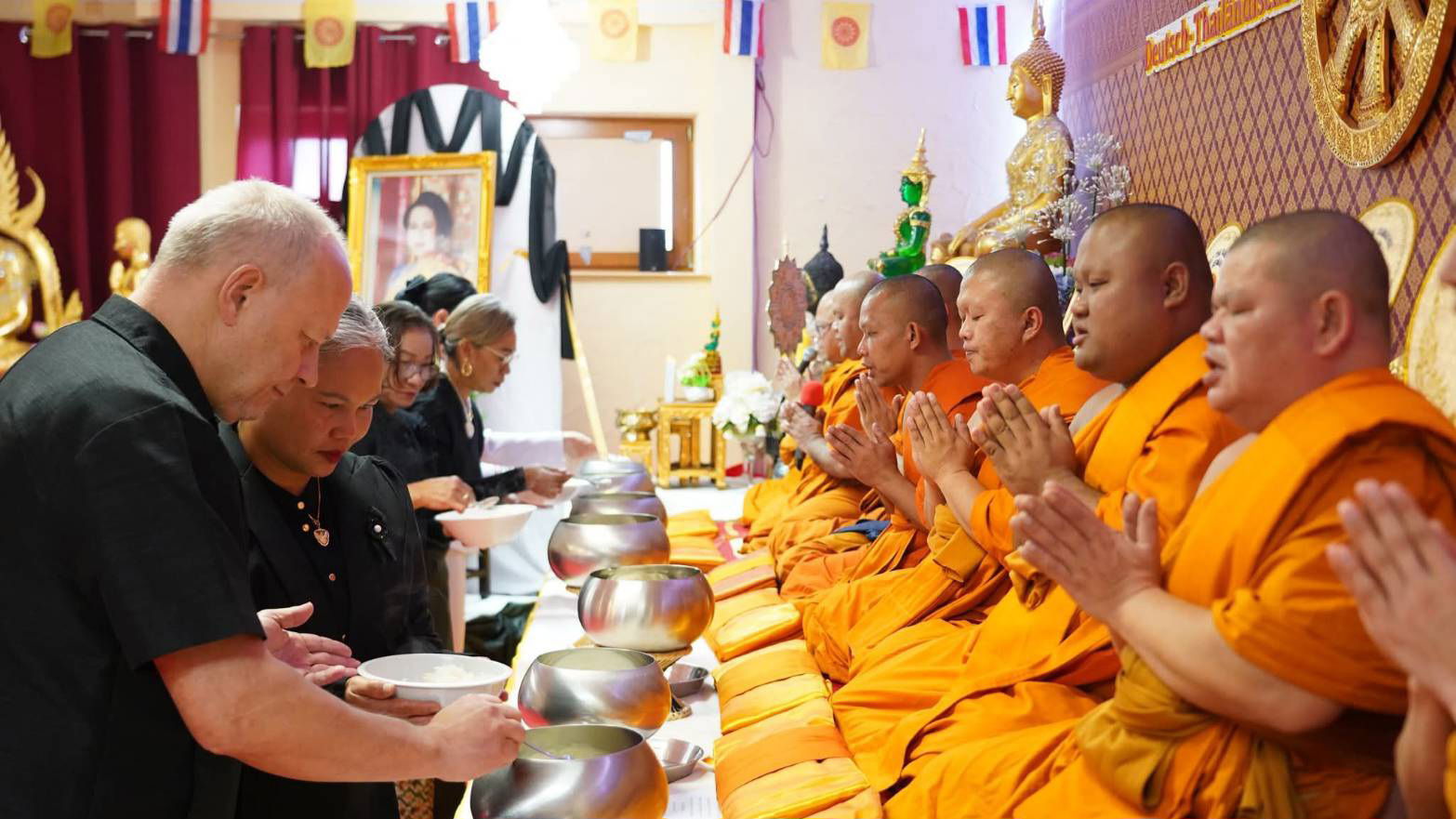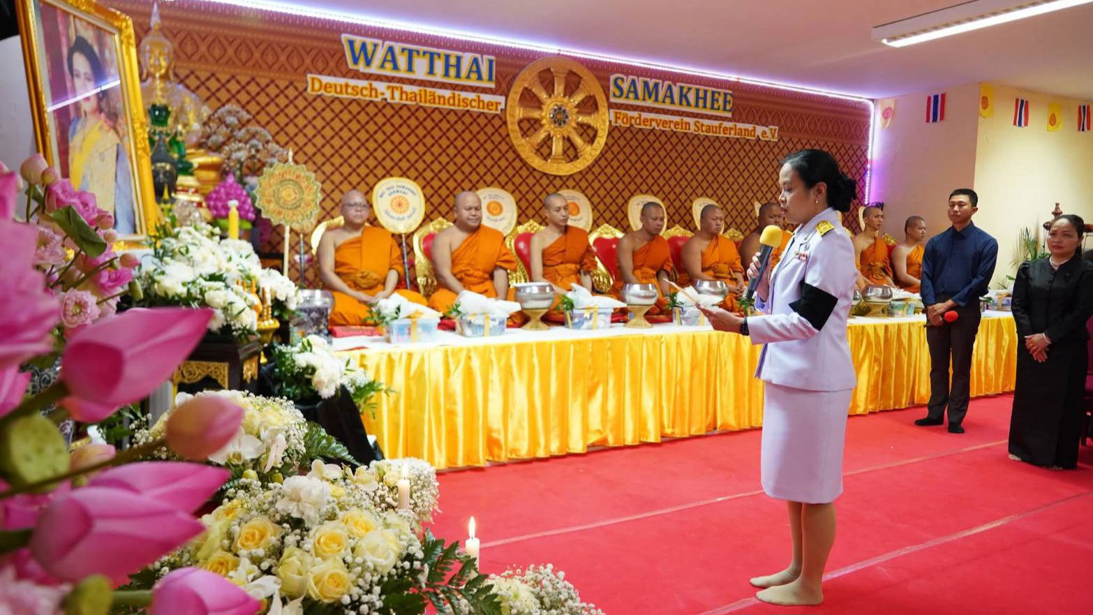 พิธีครั้งนี้มี พระครูสุตวิริยวิเทศ เจ้าอาวาสวัดไทยสามัคคี เป็นประธานฝ่ายสงฆ์ และ คุณประเพ็ญพิมพ์ ประจนปัจจนึก กงสุลใหญ่แห่งสถานกงสุลนครมิวนิก เป็นประธานฝ่ายฆราวาส โดยมีข้าราชการไทย ประชาชนชาวไทยในเขตต่าง ๆ ของเยอรมนี รวมถึงชาวต่างชาติผู้สนใจพระพุทธศาสนา เข้าร่วมฟังพระสวดพระพุทธมนต์และร่วมบำเพ็ญกุศลในบรรยากาศเปี่ยมด้วยความสงบและศรัทธา