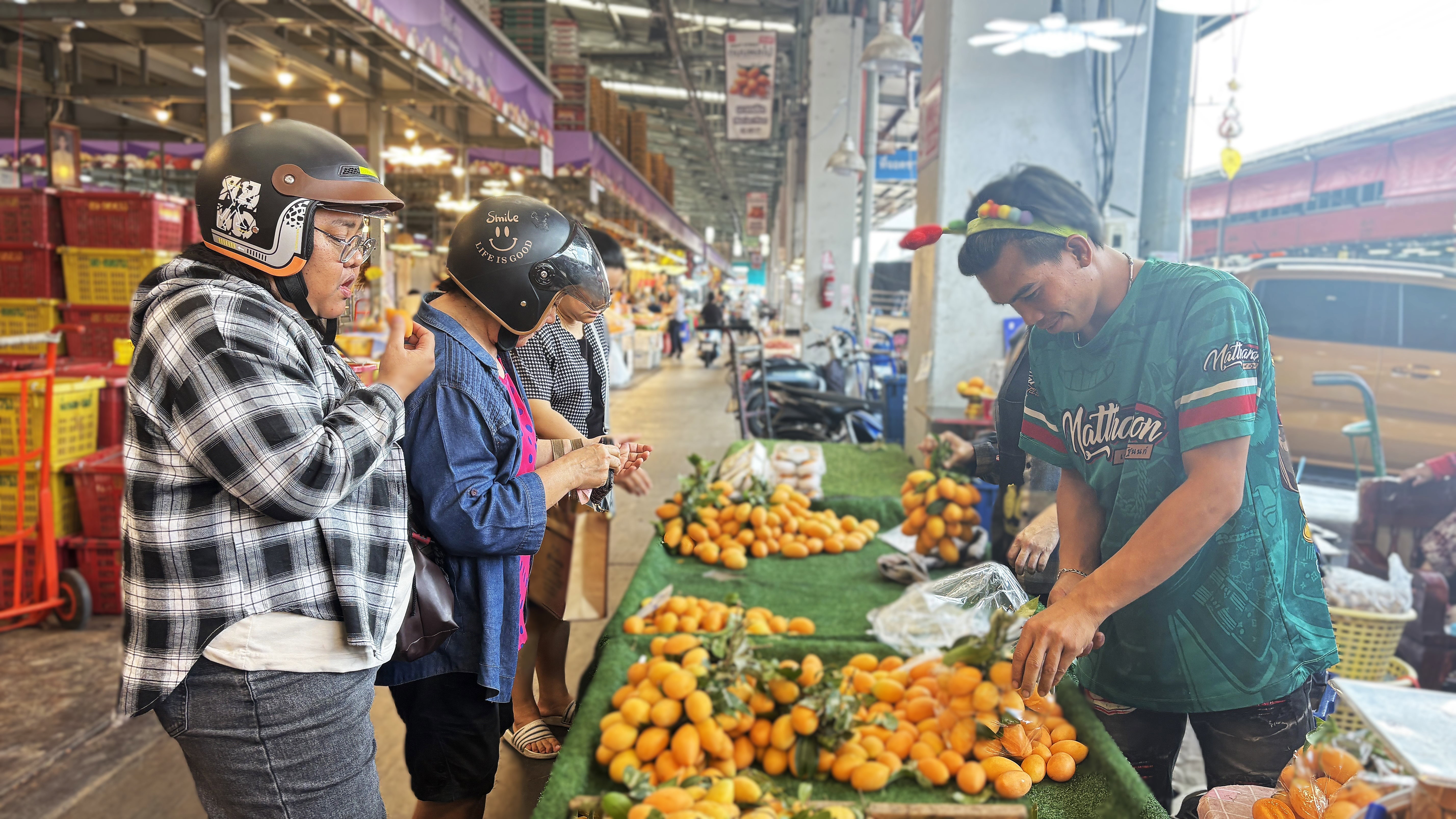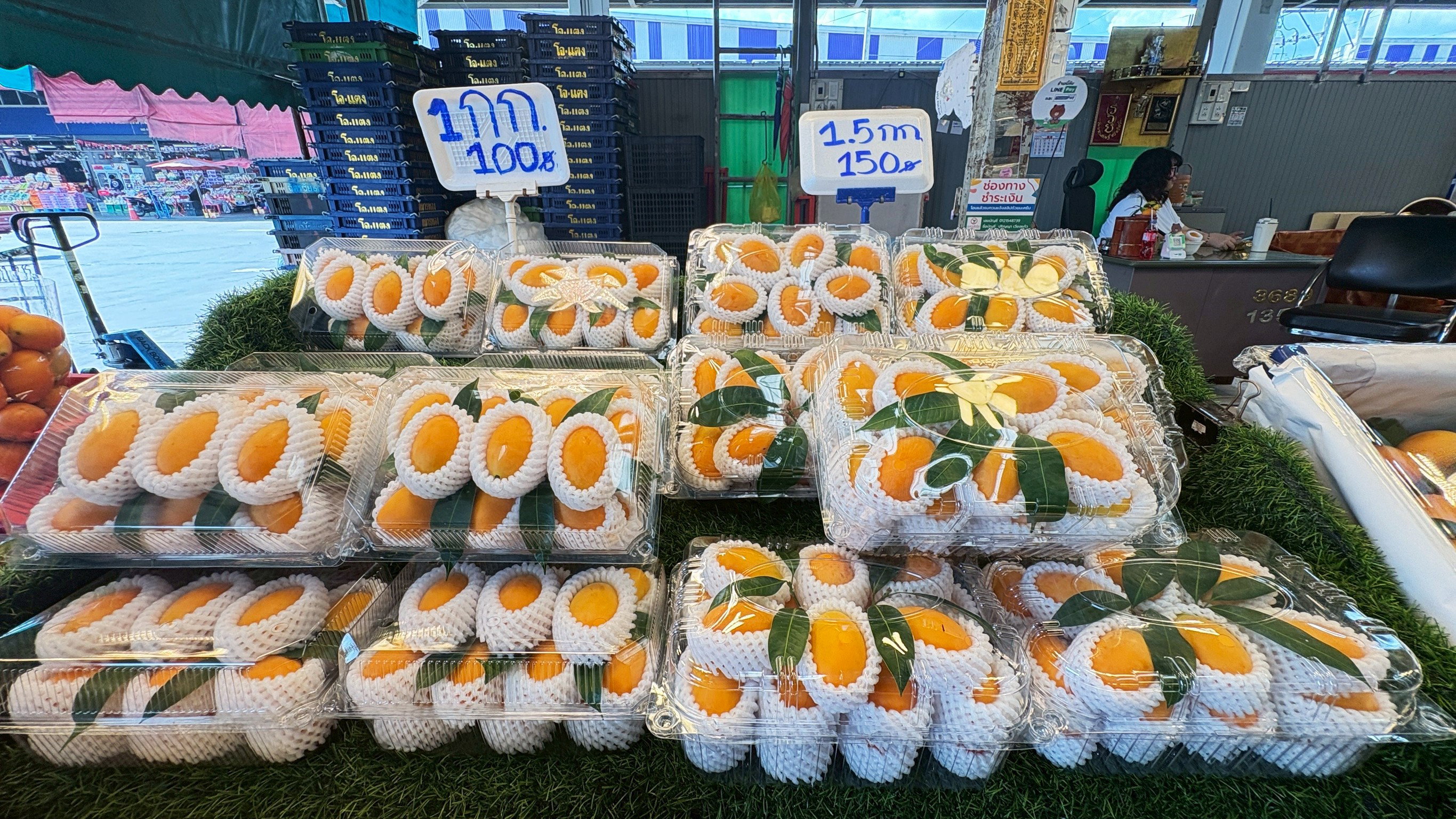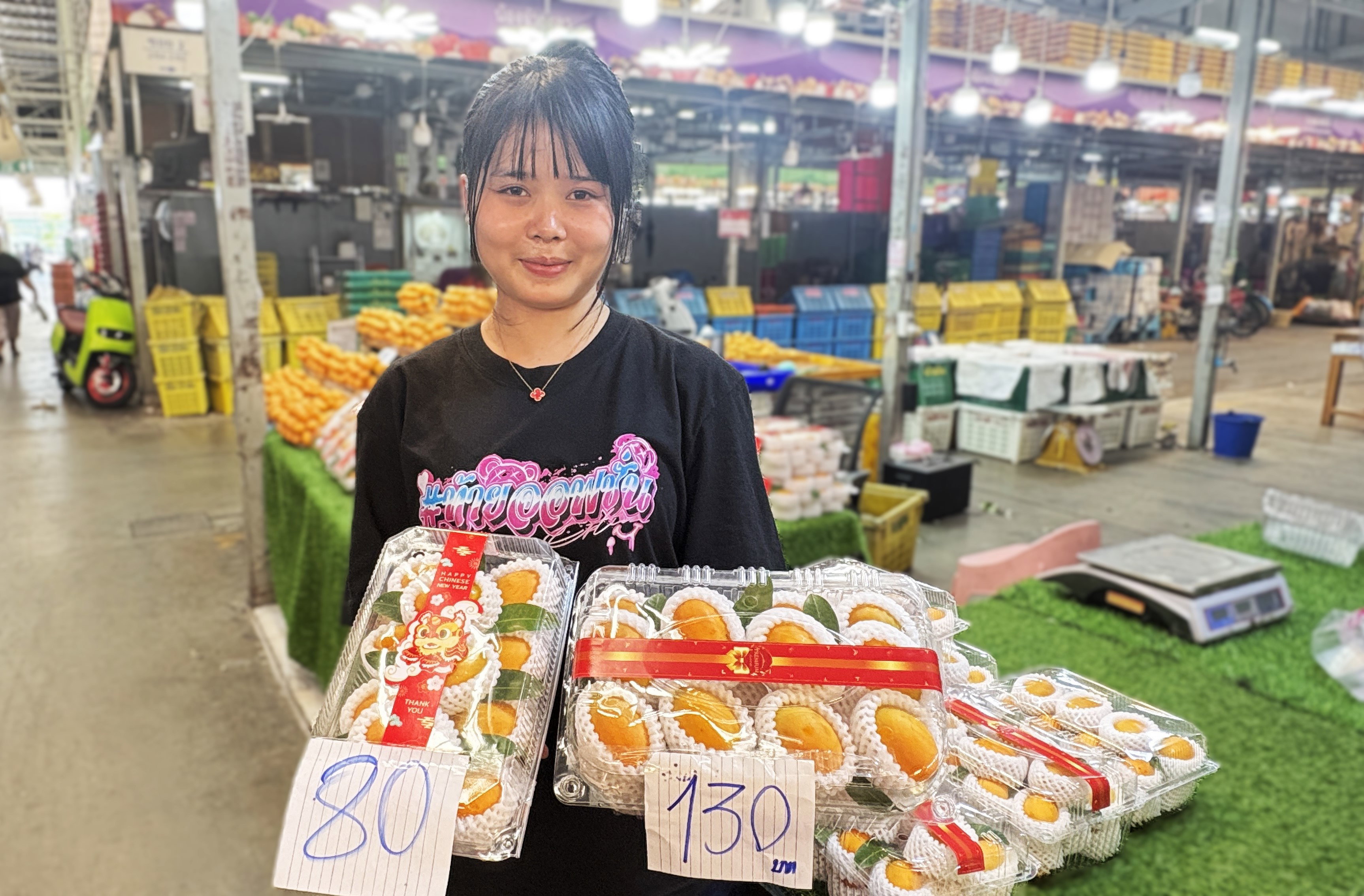 บรรยากาศการซื้อขายในโซนผลไม้ของตลาดสี่มุมเมืองคึกคัก หลังเข้าสู่ช่วงเดือนมีนาคมซึ่งเป็นช่วงผลผลิตออกมากที่สุดของปี โดยเฉพาะมะยงชิด ผลไม้ฤดูสั้นที่มีให้รับประทานเพียงปีละครั้ง ช่วงกุมภาพันธ์–มีนาคม ผลจะมีขนาดใหญ่ เนื้อแน่น รสหวานอมเปรี้ยว แหล่งปลูกสำคัญมาจากจังหวัดนครนายกและพิจิตร ก่อนที่ผลผลิตจะเริ่มลดลงในช่วงต้นถึงกลางเดือนเมษายน